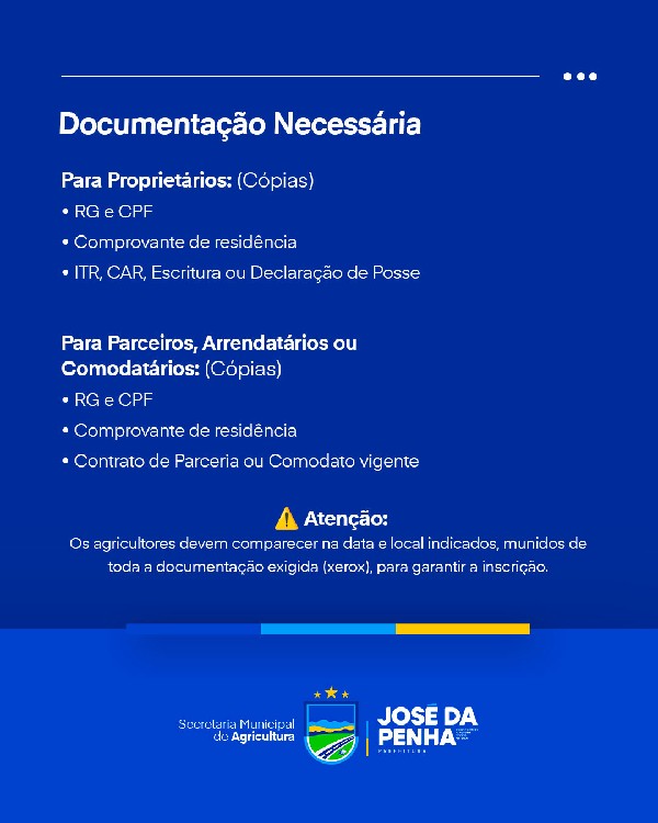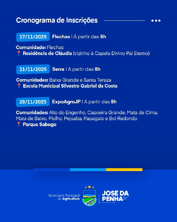 A Secretaria Municipal de Agricultura divulga o cronograma de inscrições do Programa de Corte de Terra 2025, que beneficiará as comunidades rurais de José da Penha.