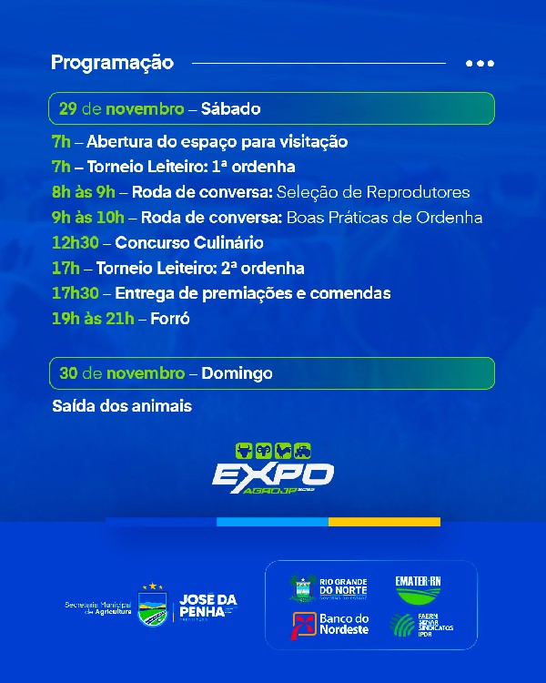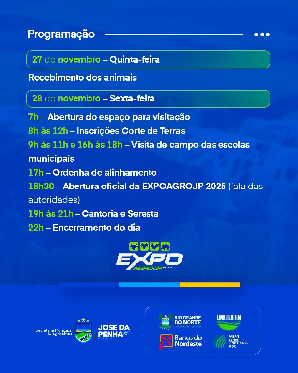Nos dias 28 e 29 de novembro, o Parque Sabugo será palco da 1ª ExpoAgroJP, reunindo criadores, agricultores, empreendedores e toda a força da nossa gente.