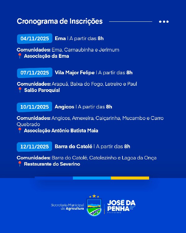 A Secretaria Municipal de Agricultura divulga o cronograma de inscrições do Programa de Corte de Terra 2025, que beneficiará as comunidades rurais de José da Penha.